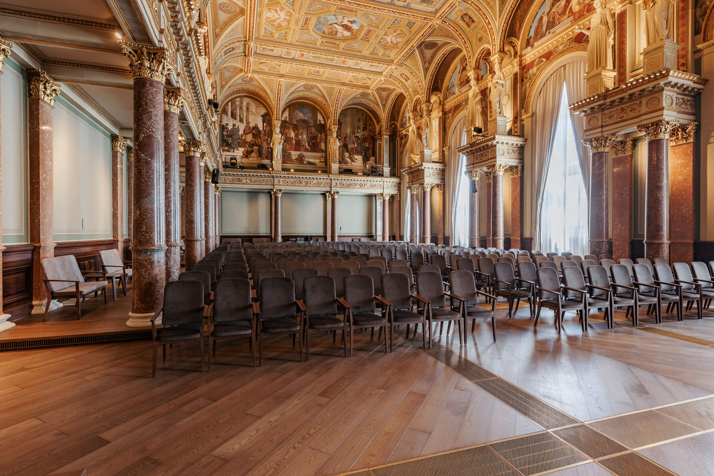 A Székház hivatalos megnyitójára is itt került sor 1865-ben. A mennyezet és a karzat stukkói már az építés során megvalósultak, azonban a falfestményekkel kapcsolatos dekorációs munkák sokáig várattak magukra.