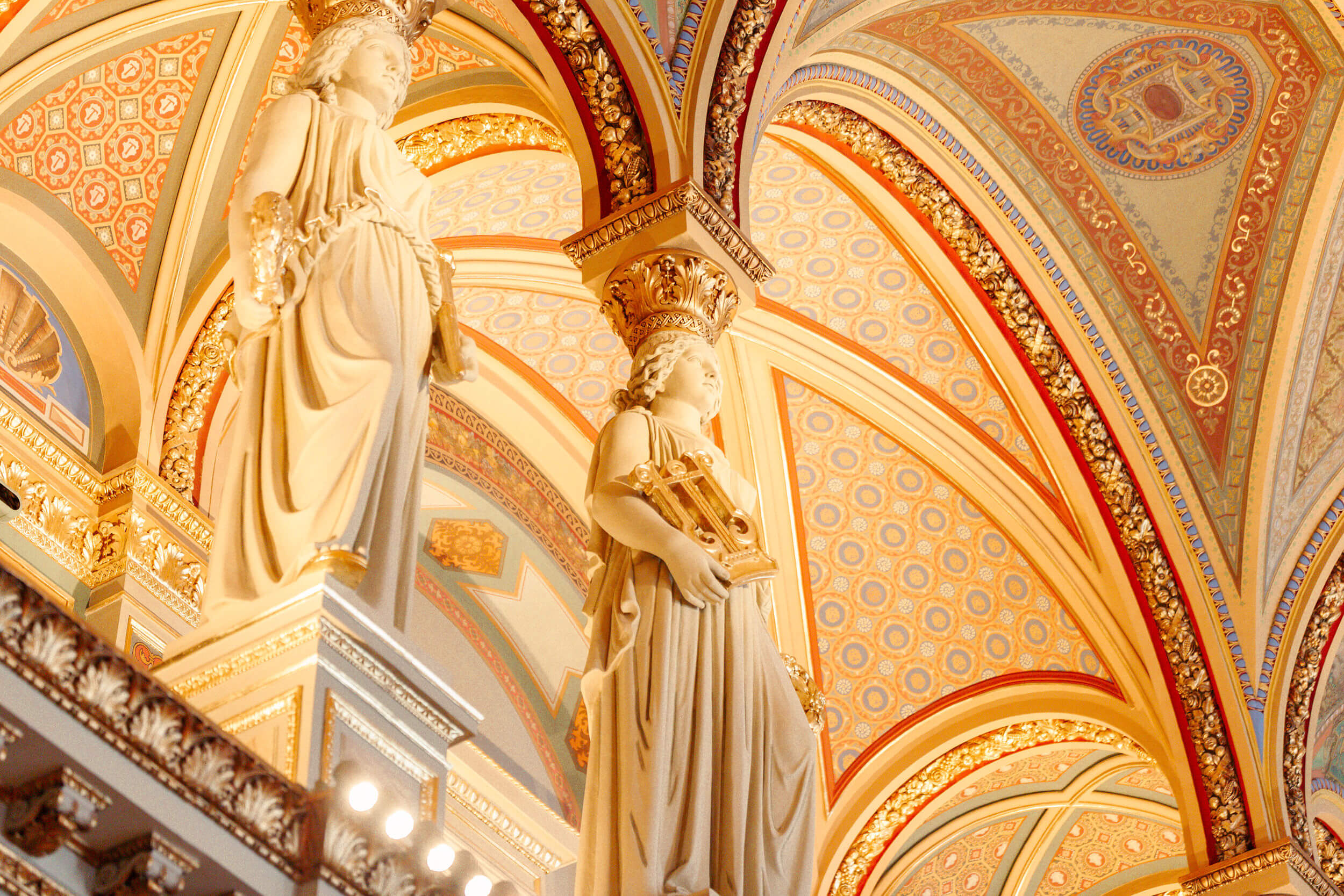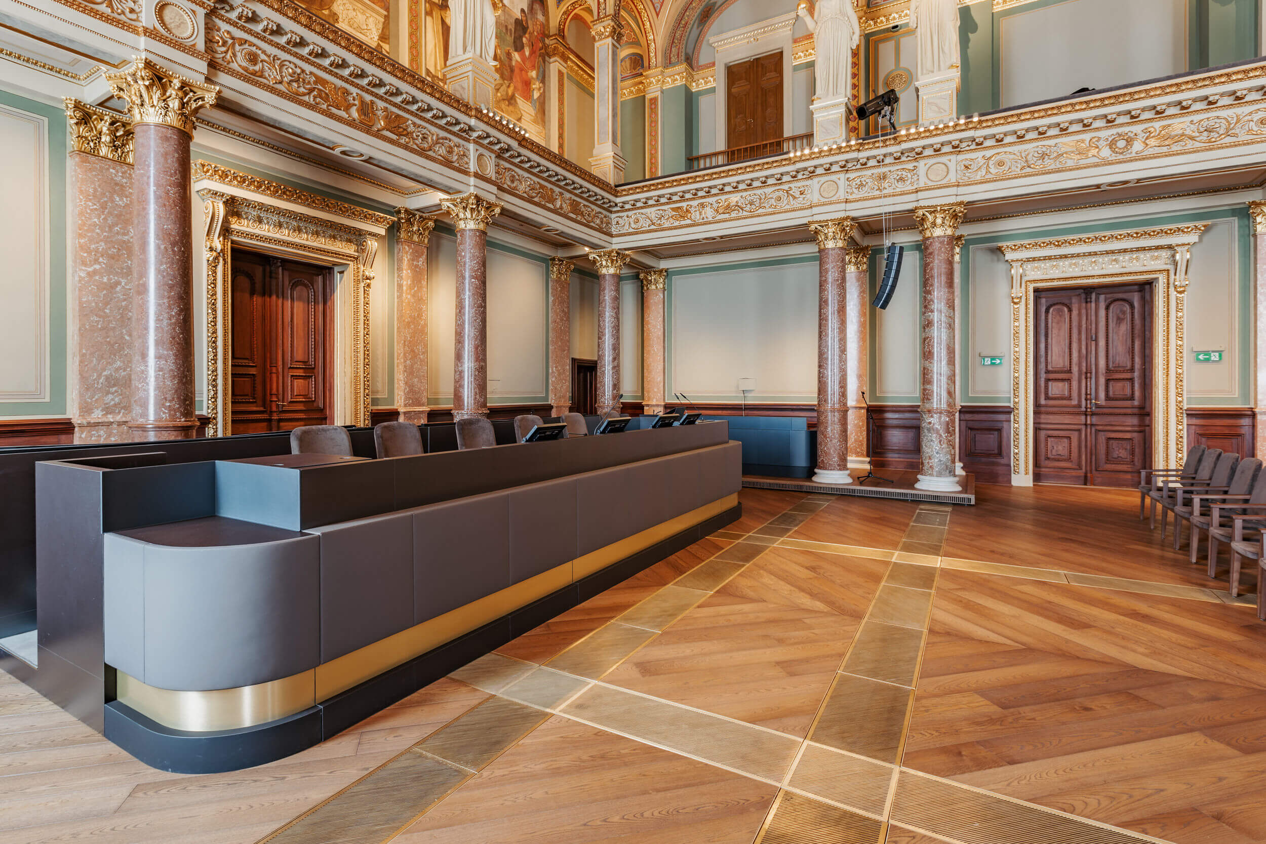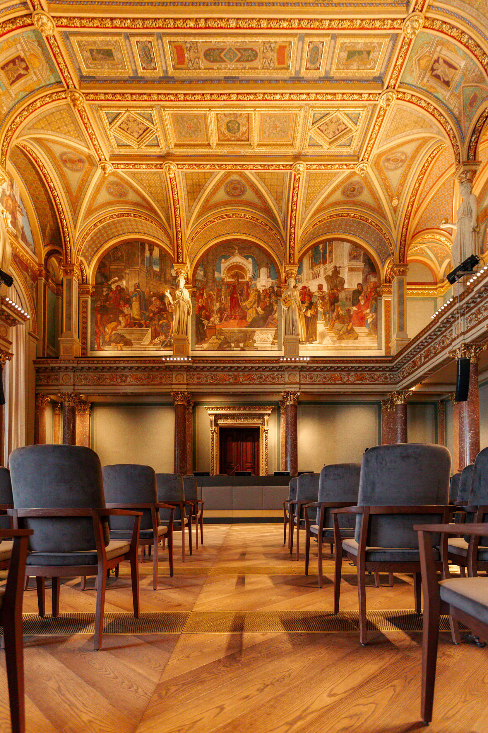 A mennyezeten és a falakon gazdag stukkó- és falképdísz, díszítőfestés és alakos festések, és „Lotz secco-k” találhatók, a mennyezet közepén a helyreállított ország címerrel, a „kis címerrel”.