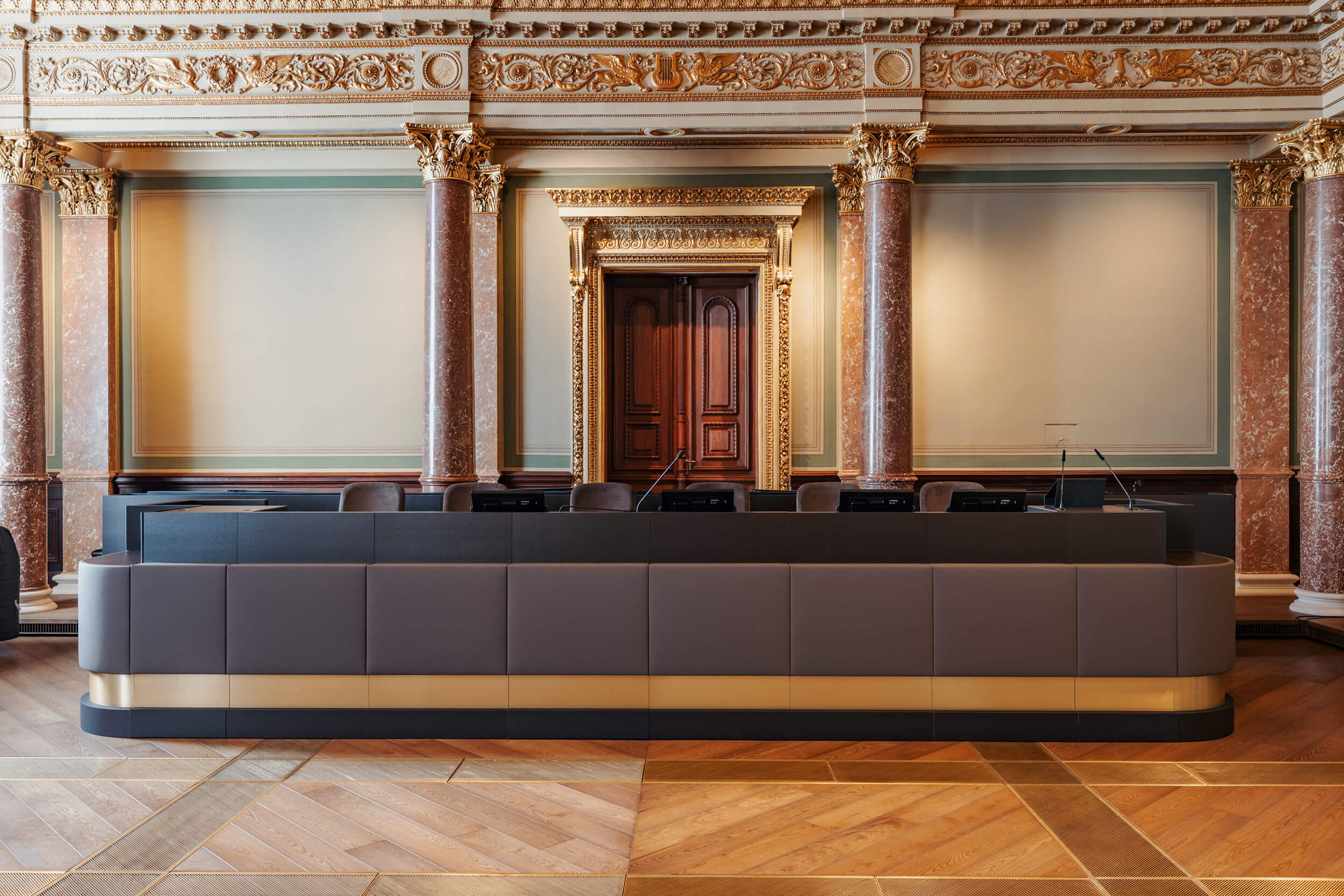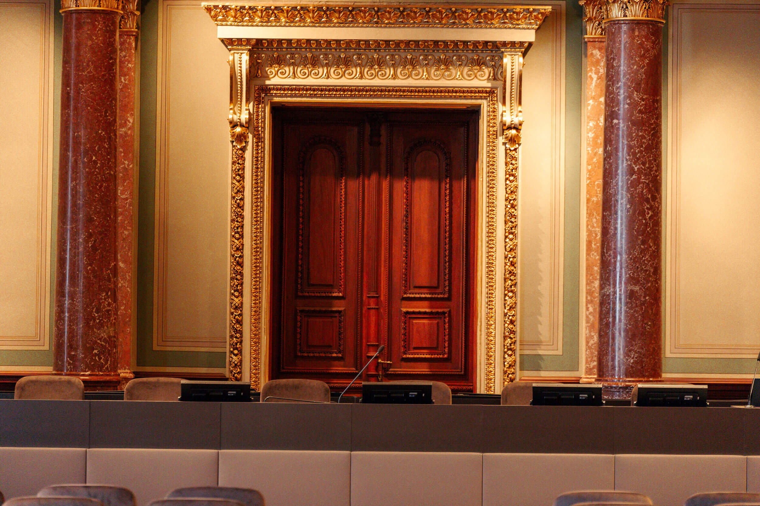 A MTA Székház Díszterem összművészeti alkotásként megjelenő székház ikonográfiájának központi eleme. Téglalap alaprajzú, „adneti scheck” vörös mészkő oszlopsorral, felette kariatidákkal.