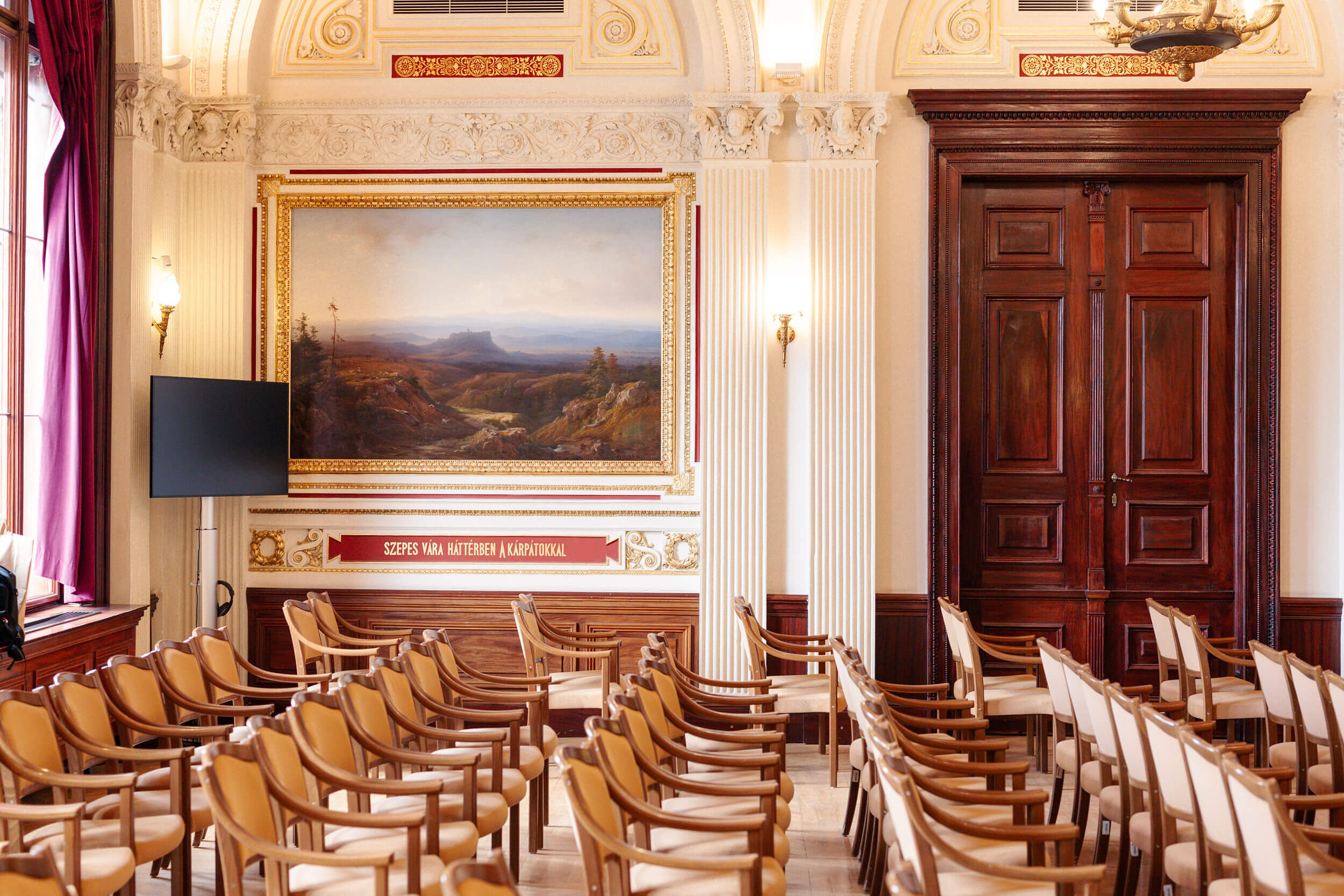 A terem két traktusból állt: a közönség az árkádsor mögül hallgathatta a tudományos eseményeket. Mennyezetét Marschalkó János készítette Berlinből rendelt modellek alapján, falait Ligeti Antal négy városvárat ábrázoló festményei díszítették.