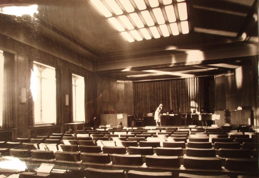 A háború utáni, 1949-es helyreállítás során az MTA Székház Nagyterem déli termét egyesítették az északi helyiségekkel, így jött létre az egységes, nagy előadóterem.