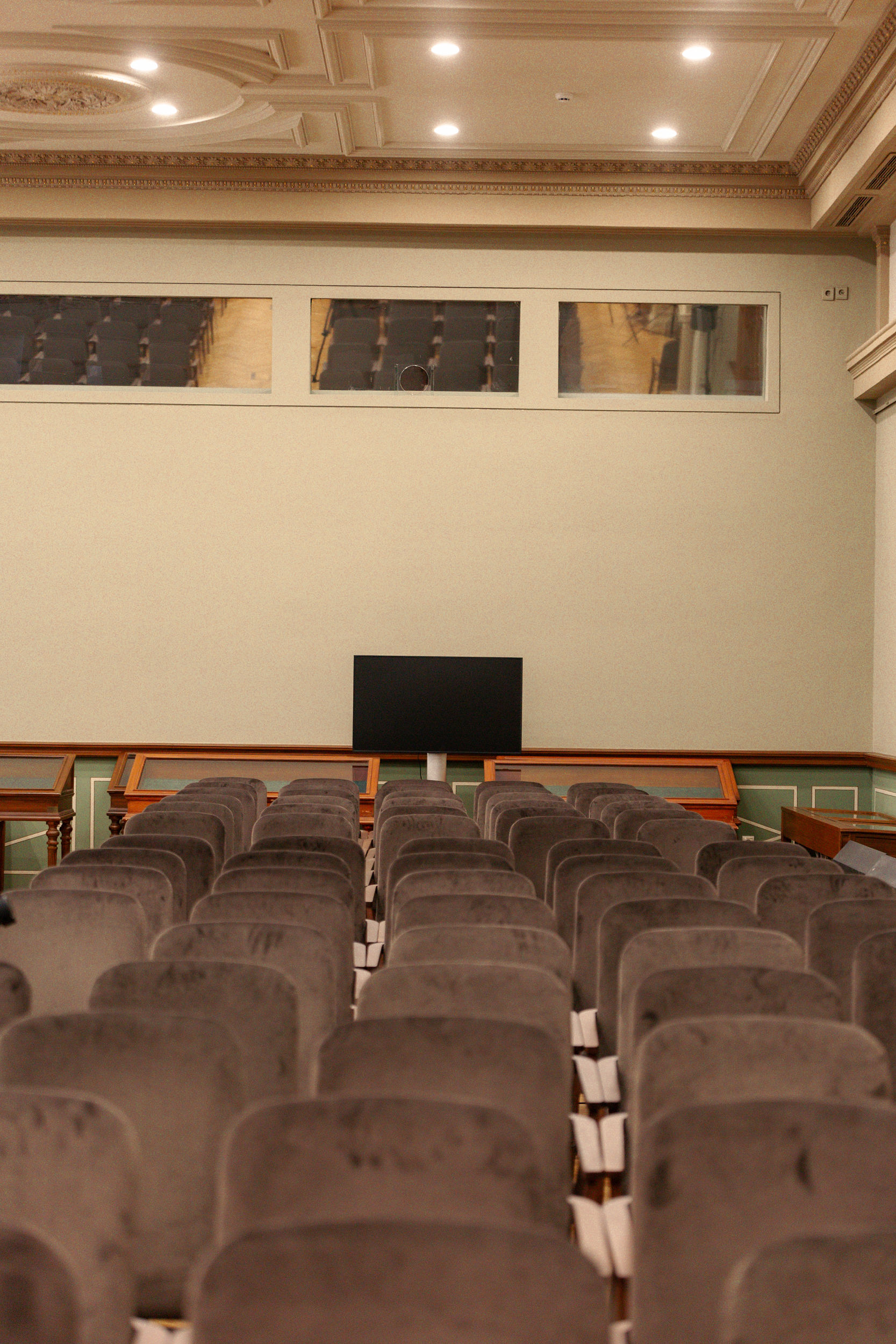 A terem északi részében irodákat, raktárakat és tolmácsfülkét alakítottak ki, megőrizve az épület történeti karakterét, de korszerű funkciót adva neki.